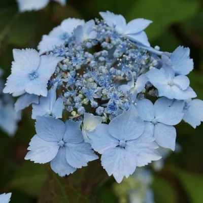 Цветение начинается в июле и продолжается до августа, иногда затягиваясь до сентября. Соцветия имеют щитковидную форму, могут быть плоскими или слегка выпуклыми, достигая диаметра 15-20 см. Цветки формируются на побегах прошлого года, при этом центральные цветки могут быть белыми, розовыми или голубыми, а основной оттенок — голубой. Способность цветков менять свой цвет в зависимости от типа почвы делает этот сорт поистине уникальным.